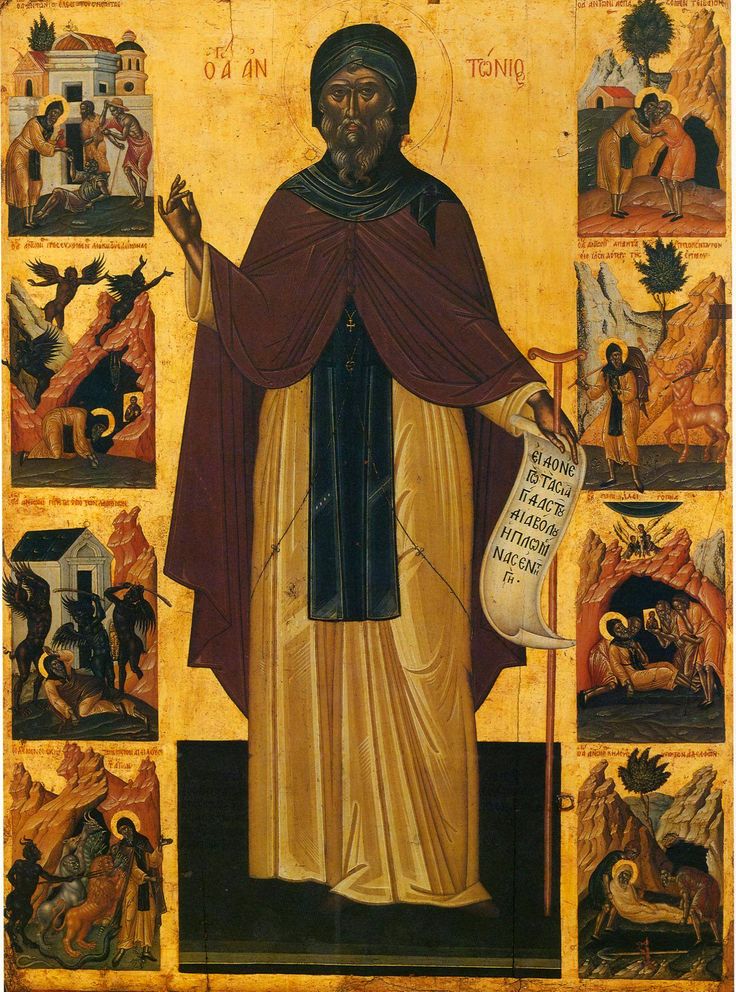 聖安東尼的生平(其作者被認為是聖亞他那修)記載了以下關於這位被尊為修士之首任院長的事蹟:安東尼是埃及人,出身於顯貴的基督徒家庭,但在年幼時便失去了雙親。有一次,他在教堂聽到誦讀福音中的這段話:「你若願意作完全人,可去變賣你所有的,分給窮人。」他隨即將這些話視為對他個人的呼召,因此將所有財產分給了窮人。由於他即將踏入與撒但作戰的戰場,他首先留意所有在各樣恩賜上卓越的人所立的榜樣,並努力效法他們。在警醒、克己和不斷研讀聖經方面,他無人能及。他對異端和分裂教會者,特別是亞流派,深惡痛絕,以至於從不接近他們。他睡在地上。他吃麵包時只配鹽,只喝水。他從不在日落前進食或飲水,並常常一次禁食兩天。他常常通宵祈禱。作為上帝如此勇敢的戰士,他受到魔鬼各樣試探的攻擊。他前往埃及周圍的曠野,許多門徒在他的指導下成為修士。邪魔的攻擊日益猛烈,但他對抗它們的力量也日益增強。最後,他開始嘲笑它們的無能,說:「撒但害怕善人的祈禱和禁食,但最重要的是,害怕他們對我們主的熱切之愛,光是祂十字聖號就足以使牠逃之夭夭。」他成為魔鬼極其畏懼的對象,以致許多被牠們折磨的人只要呼求他的名字就能得到解脫。此外,他的聖德名聲遠播,以至於君士坦丁大帝和他的兒子們寫信給他,請求他為他們代禱。在他一百零五歲那年,激勵了無數人效法他的榜樣後,他於主後356年1月17日榮歸天國。